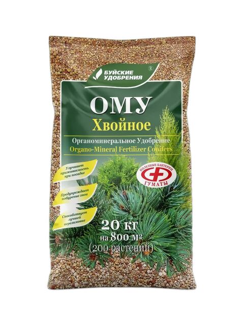 ОМУ Хвойное – комплексное органоминеральное гранулированное удобрение на основе соединений азота, фосфора, калия, серы и микроэлементов. Не содержит хлора и подобных для растений вредных веществ. Длительного действия. В процессе производства удобрения минеральные элементы взаимодействуют с гуминовыми соединениями и образуют органоминеральные комплексы. В них фосфор и калий находятся в форме, легко усвояемой растениями, а азот закрепляется и не вымывается. Эффективность использования таких комплексов достигает 95%.