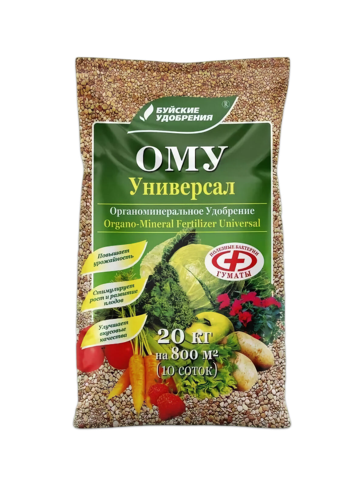 ОМУ Универсал – комплексное органоминеральное гранулированное удобрение для подкормкипрактически для всех плодовых и ягодных культур на основе соединений азота, фосфора, калия, серы и микроэлементов. Ускоряет созревание плодов и ягод, улучшает их вкусовые качества, лёжкость плодов при хранении. Не содержит хлора и подобных для растений вредных веществ. Длительного действия. Состав: соединения азота - 7%, фосфора – 7%, калия – 8%, магния – 1.5%, серы – 3.6%, гуминовые соединения (органические вещества) – 2,6%, микроэлементы: медь, бор, железо, марганец, молибден, цинк – до 1%. ОМУ Универсал представляет собой гранулы темно-серого цвета диаметром от 1 до 5 мм, что обеспечивает ему длительность действия. Удобрение производится на основе низинного торфа (составляет 40% в удобрении), в состав которого изначально входят гуминовые соединения и микроэлементы. В процессе производства удобрения минеральные элементы взаимодействуют с гуминовыми соединениями и образуют органоминеральные комплексы. В них фосфор и калий находятся в форме легко усвояемой растениями, а азот закрепляется и не вымывается. Эффективность использования таких комплексов достигает 95%.