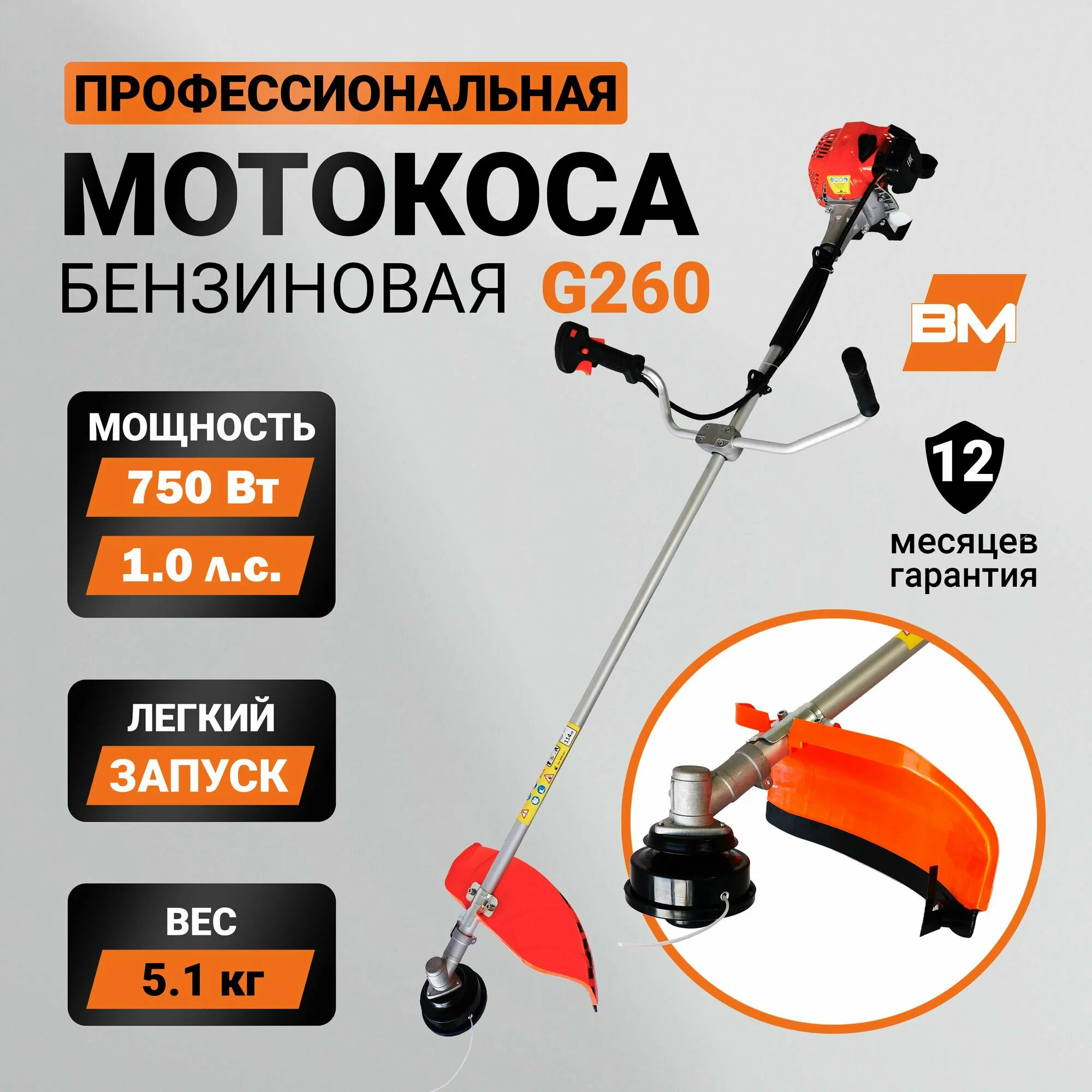 Мотокоса бензиновая BM G260 - ваш надежный помощник в уходе за садом и приусадебным участком. С двухтактным двигателем мощностью 1 л. с. и объемом 25.4 куб. см, эта мотокоса способна справиться с любыми задачами. Ширина скашивания 25,5 см позволяет эффективно обрабатывать большие площади, делая эту модель идеальной для прореживания древесной поросли.
